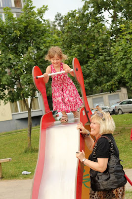 19:24 Подвозим бабушку к дому, а вроде и жара спала, поэтому решаем ещё немного поиграть на детской площадке: